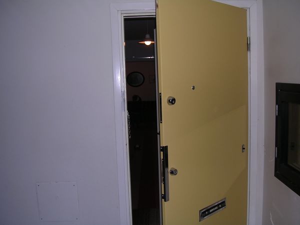 Every front door in these apartment houses has a double door. This is on the inside looking at the outside door. You an